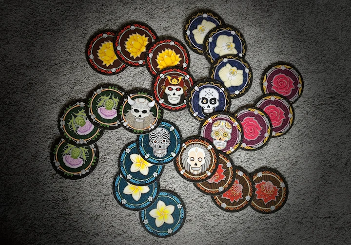 Each player’s hand consists of three discs with a flower design and a fourth depicting a skull. In addition, each player has a square mat in their chosen colour placed in front of them to track their score. A flipped mat denotes that they’ve won one round, win a second round and they’ve won the game. Play continues clockwise until everyone has placed down a mat. For subsequent loops of the table players continue placing mats down or start the bidding. Once bidding starts, players must bid a higher number or pass until only one player’s bid remains. Whomever bids the highest must then demonstrate their confidence by flipping over the staked number of mats, flipping all their own mats first. Revealing a skull means they lose a random mat from their hand.