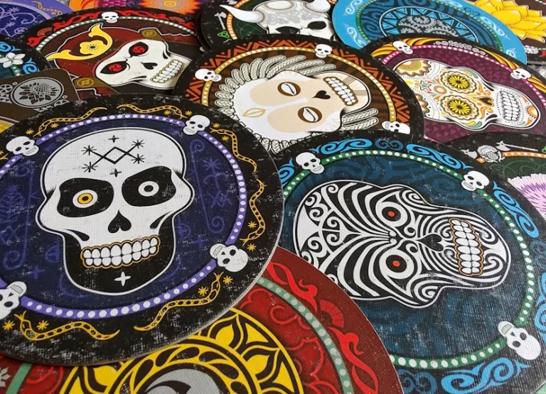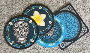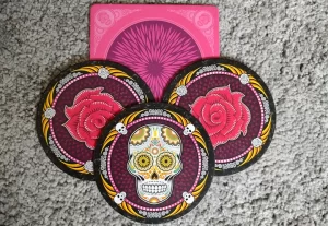 Players take turns placing a circular cardboard disc face down from their hand of four. Each is essentially an exquisitely illustrated coaster or beer mat (remember those?)– decorated with eye-catching motifs and colours akin to something from a Mexican Day of the Dead celebration.