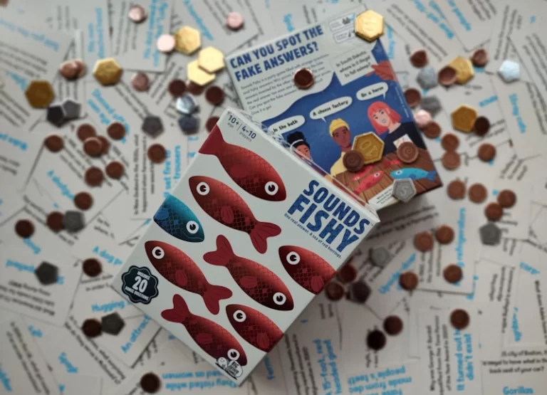 Big Potato’s “Sounds Fishy” is essentially a much pacier reimagining of the superb Balderdash – a 35+ year old boardgame classic that does away with the board and introduces a push your luck scoring mechanic to the deduction.